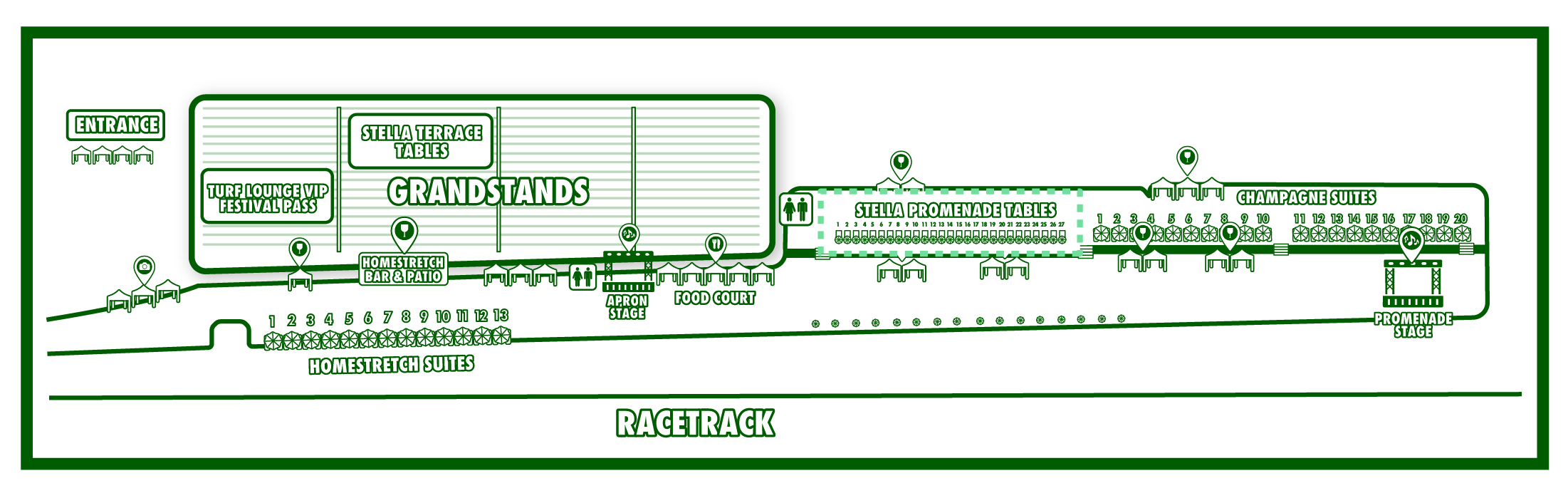 Celebrate another beautiful afternoon of race day festivities with an elevated view of the racetrack and live stage. Our promenade tables can accommodate up to 6 guests for a day of style, bubbles and trackside revelry.